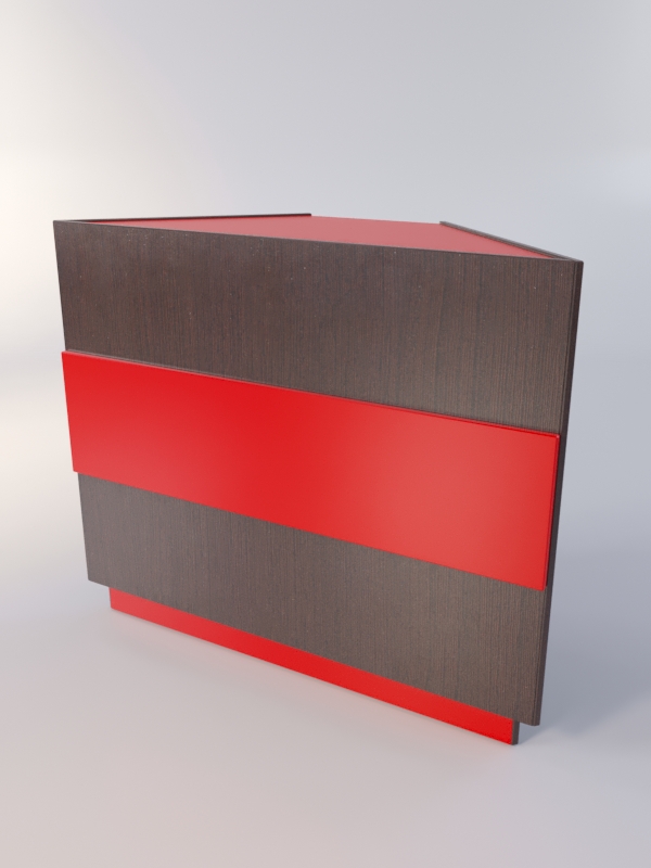 Модель имеет трапецевидную форму. Передняя панель, крыша и боковины выполнены из ЛДСП. Внутри прилавка имеется полка.