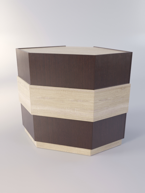 Конструкция выполнена в форме шестигранника. Крышка и боковины прилавка выполнены из ЛДСП.