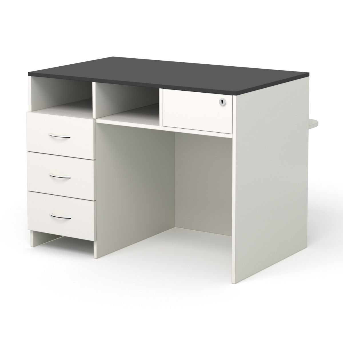Кассовый стол подойдет для магазинов различного профиля. Такой стол очень удобен для размещения кассового аппарата, ведения расчетов, а также демонстрации товаров покупателю. На фасаде имеется полка для сумок. С внутренней стороны под столешницей находится два отделения и выдвижной ящик. В левой части расположены три выдвижных ящика. Каркас выполнен из ЛДСП. Цвет подбирается в вариантах стандарт и на заказ.