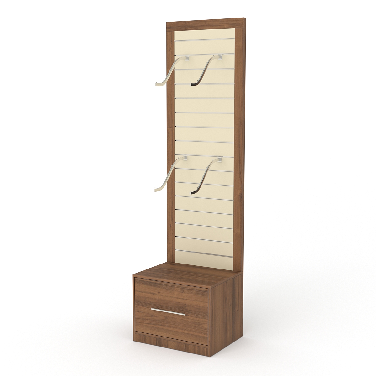 Стеллаж изготовлен из ДСП. Конструкция состоит из стенки с экономпанелью и открытой тумбы. Экономпанель предназначена для крепежа различных элементов: крючков, полок, кронштейнов и др.
