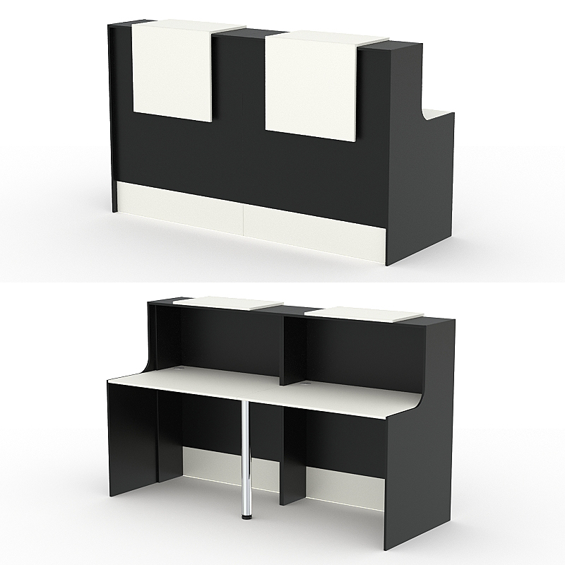 Стойка оборудована под два рабочих места. Конструкция включает две столешницы: для посетителей и администратора.