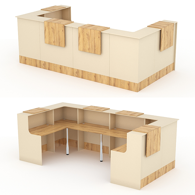 Стойка оборудована под два рабочих место. Конструкция включает две столешницы: для посетителей и администратора.
