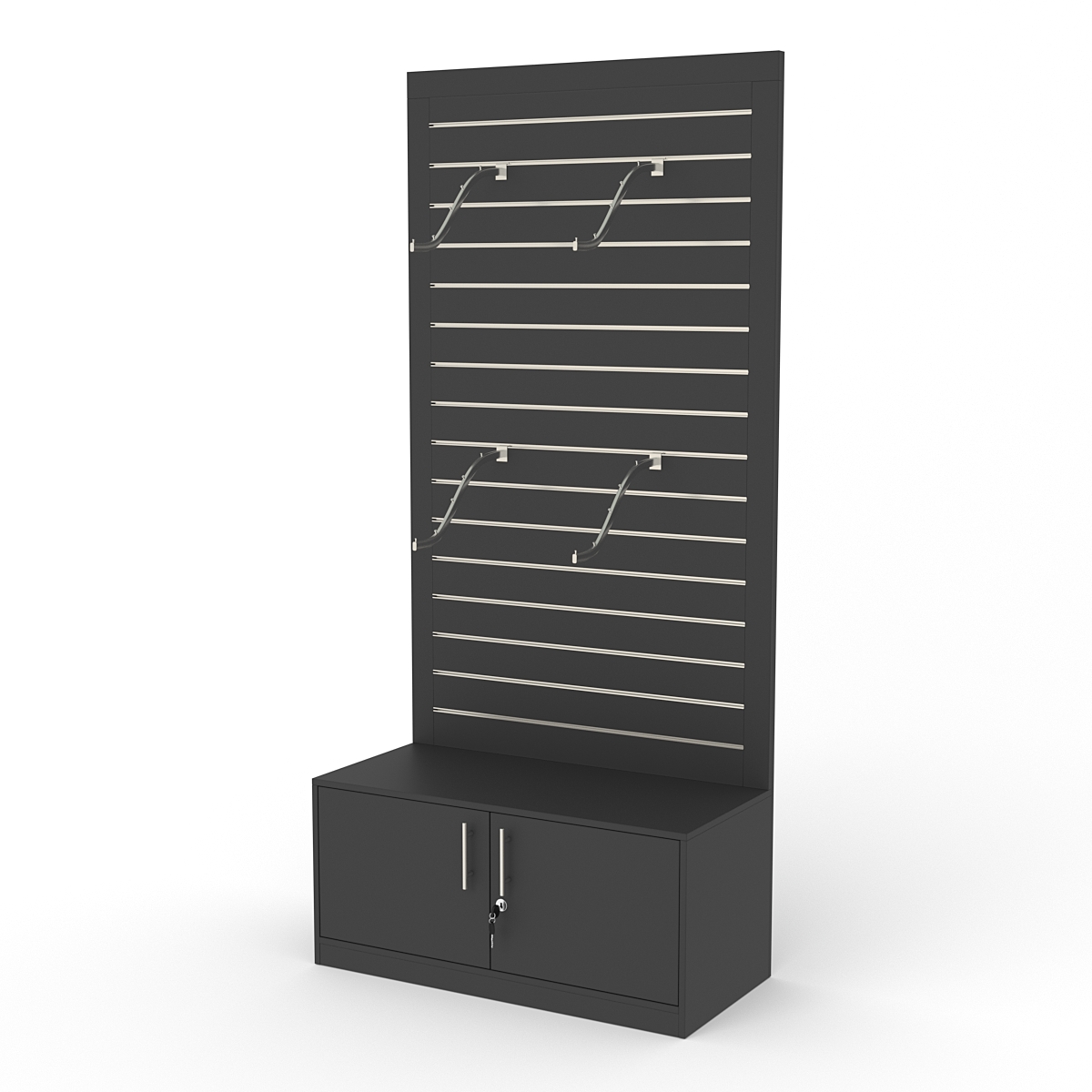 Конструкция выполнена из ДСП. Задняя стенка представляет собой экономпанель. В основании находится прямоугольная тумба с дверцами, закрывающимися на ключ.