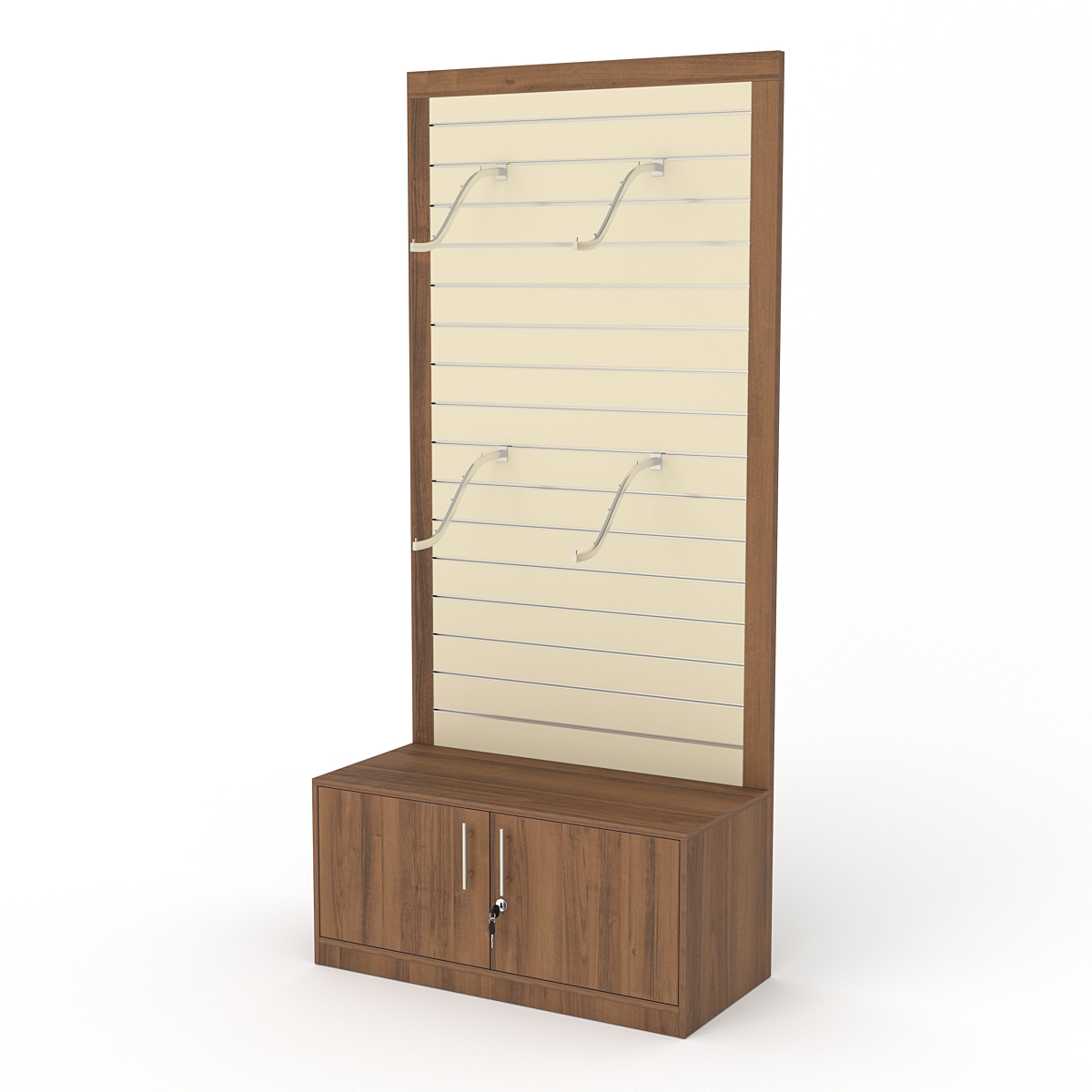 Конструкция выполнена из ДСП. Задняя стенка представляет собой экономпанель. В основании находится прямоугольная тумба с дверцами, закрывающимися на ключ.