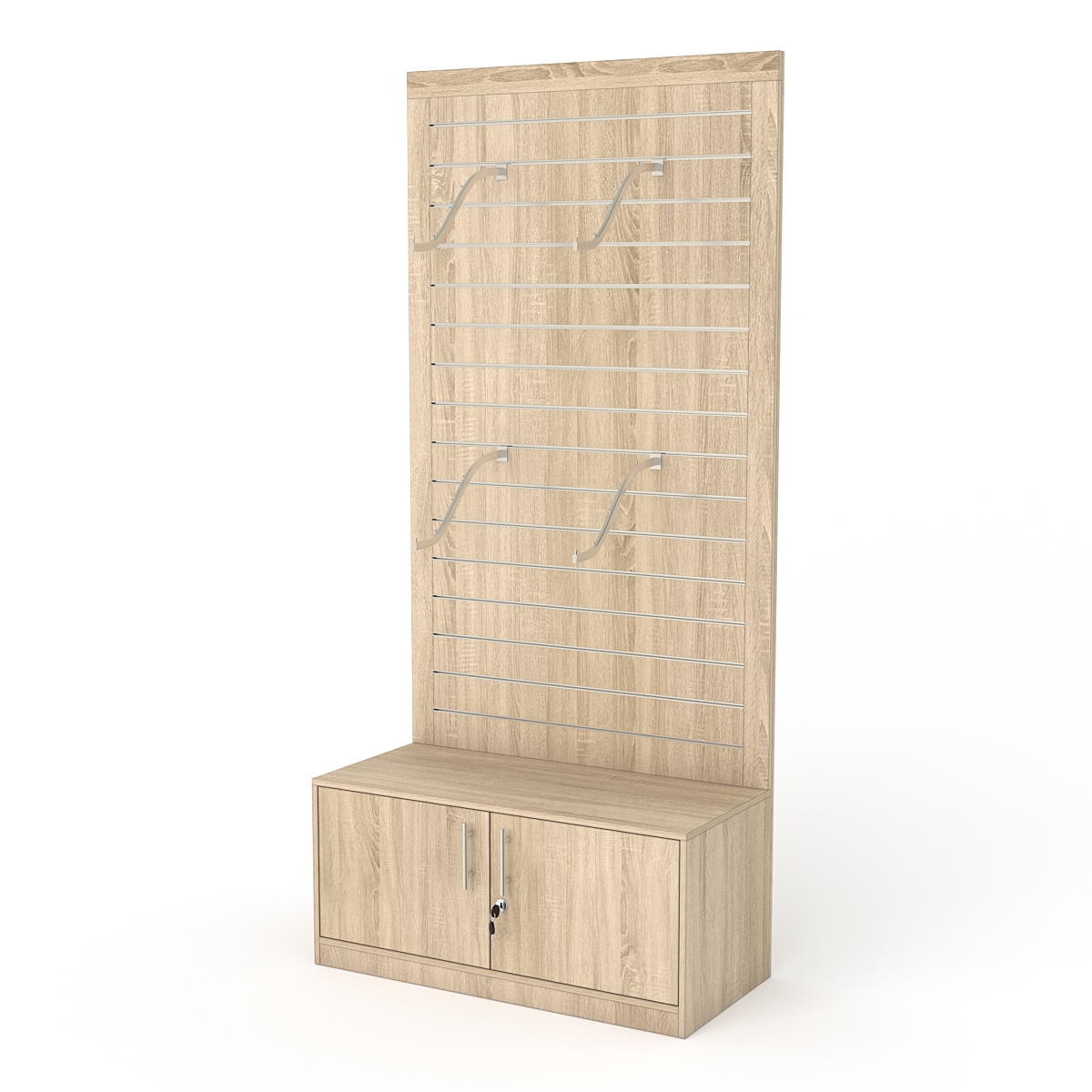 Конструкция выполнена из ДСП. Задняя стенка представляет собой экономпанель. В основании находится прямоугольная тумба с дверцами, закрывающимися на ключ.
