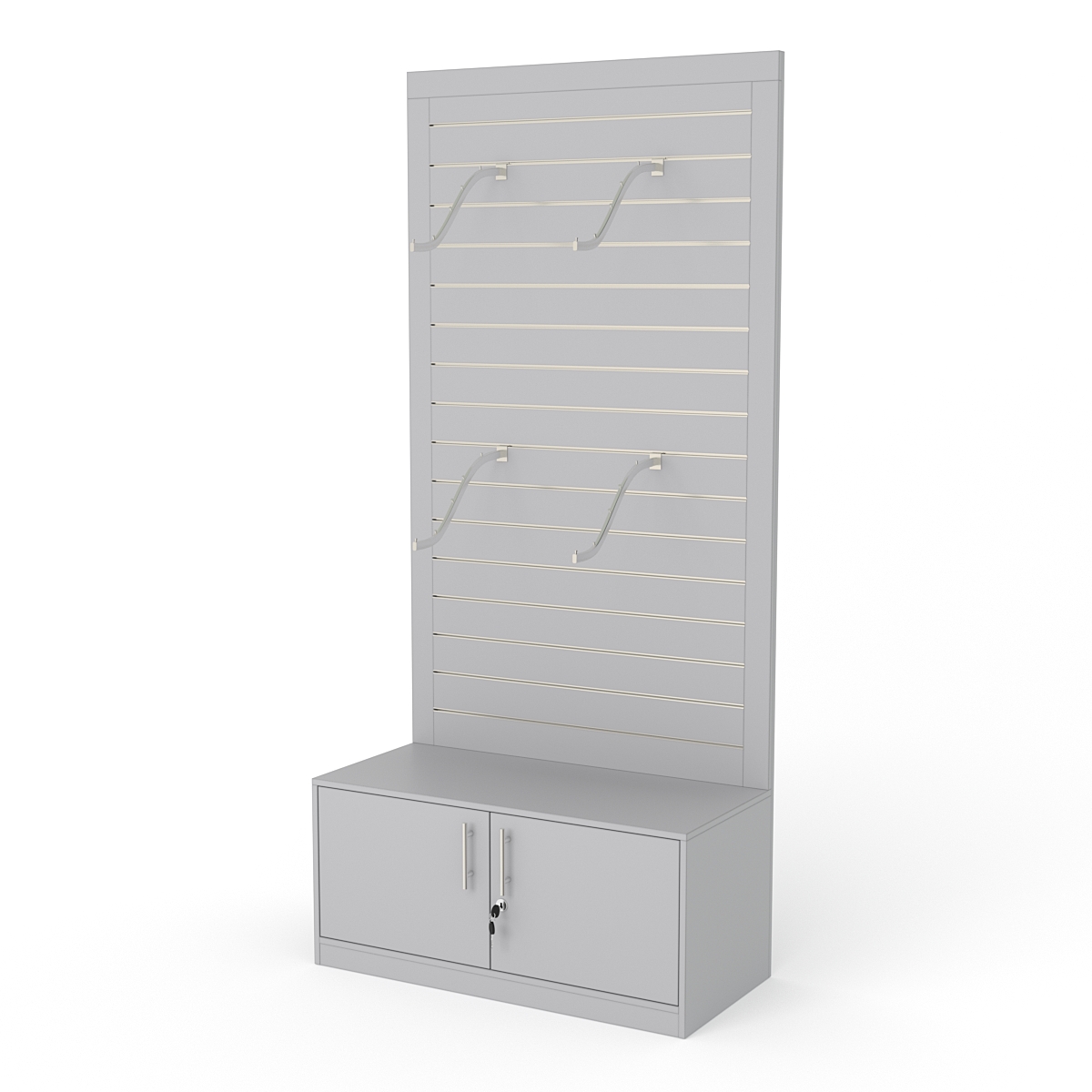 Конструкция выполнена из ДСП. Задняя стенка представляет собой экономпанель. В основании находится прямоугольная тумба с дверцами, закрывающимися на ключ.