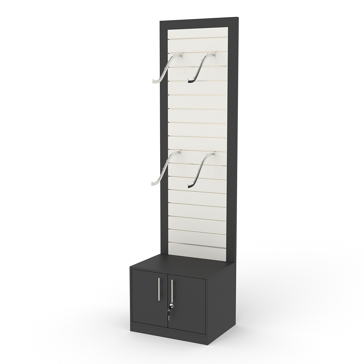 Конструкция выполнена из ДСП. Задняя стенка представляет собой экономпанель. В основании находится прямоугольная закрытая тумба. Дверца тумбы закрывается на ключ.