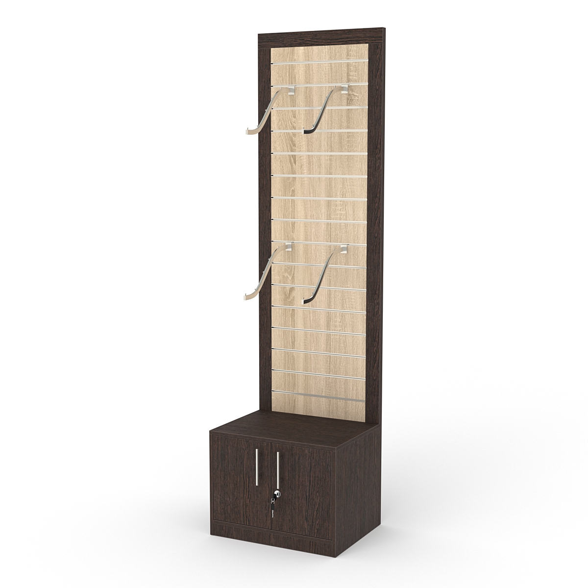 Конструкция выполнена из ДСП. Задняя стенка представляет собой экономпанель. В основании находится прямоугольная закрытая тумба. Дверца тумбы закрывается на ключ.