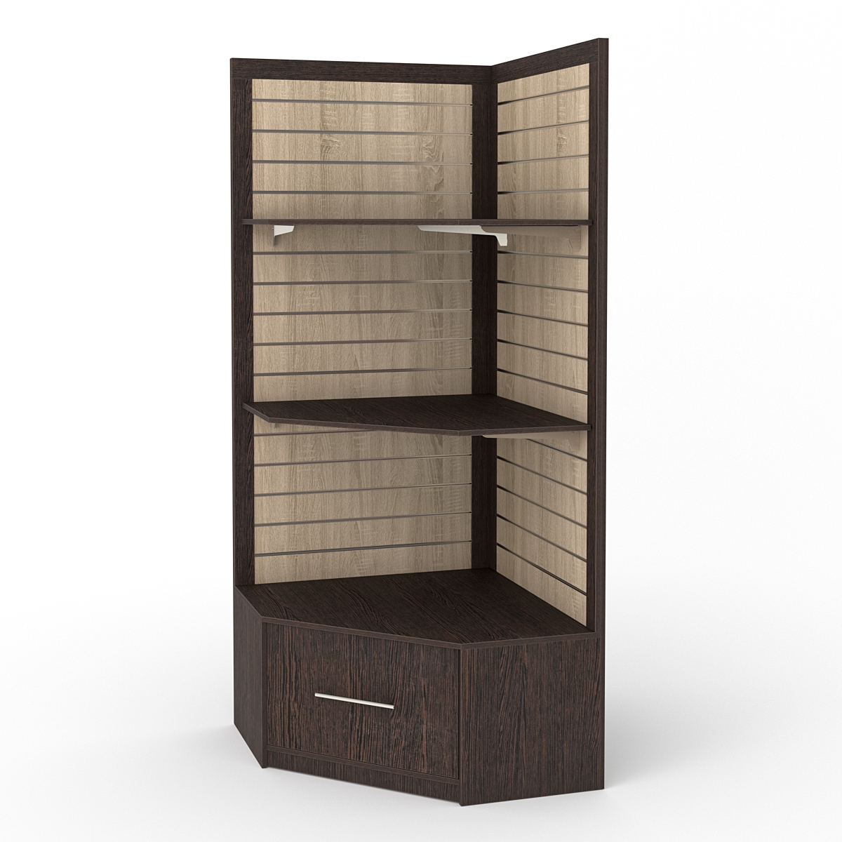 Конструкция выполнена из ДСП. Угловой стеллаж с двумя экономпанелями. В основании находится открытая пятиугольная тумба без дна.