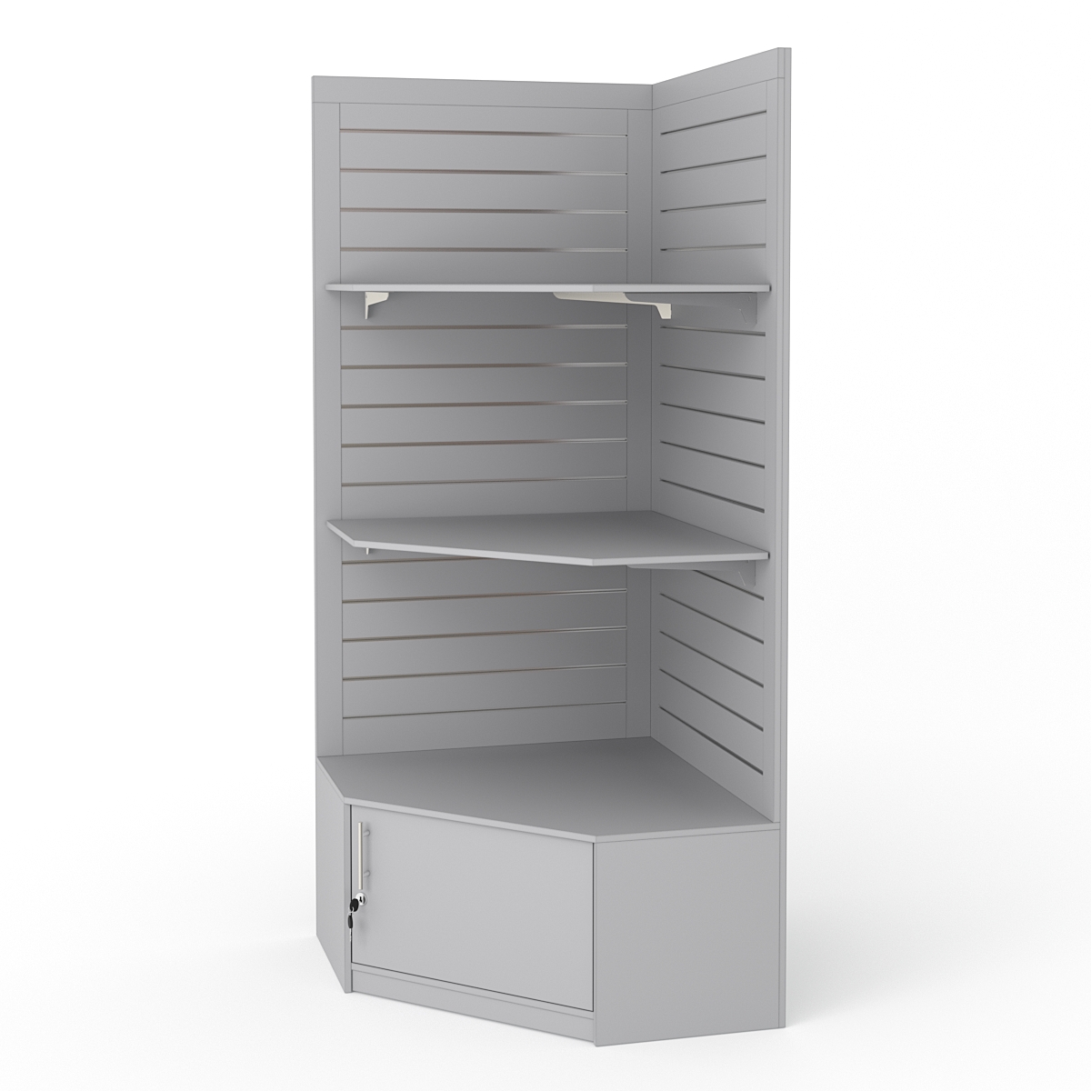 Конструкция выполнена из ДСП. Угловой стеллаж с двумя экономпанелями. В основании находится пятиугольная тумба с дверью. Дверь тумбы закрывается на ключ.