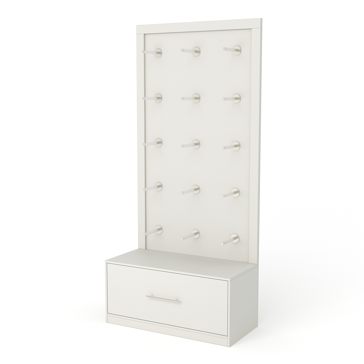 Каркас стеллажа выполнен из ДСП. Конструкция включает стенку с экономпанелью и открытую тумбу. Увеличенная ширина модели делает ее более устойчивой, в связи с чем допускается увеличение нагрузки на стеллаж.