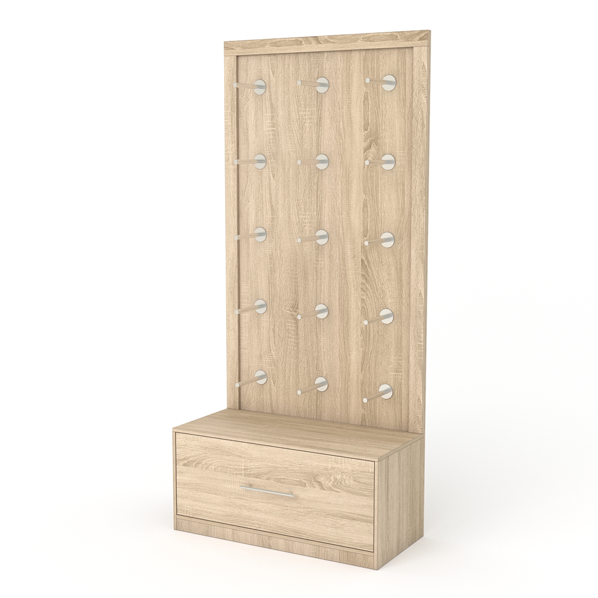 Каркас стеллажа выполнен из ДСП. Конструкция включает стенку с экономпанелью и открытую тумбу. Увеличенная ширина модели делает ее более устойчивой, в связи с чем допускается увеличение нагрузки на стеллаж.