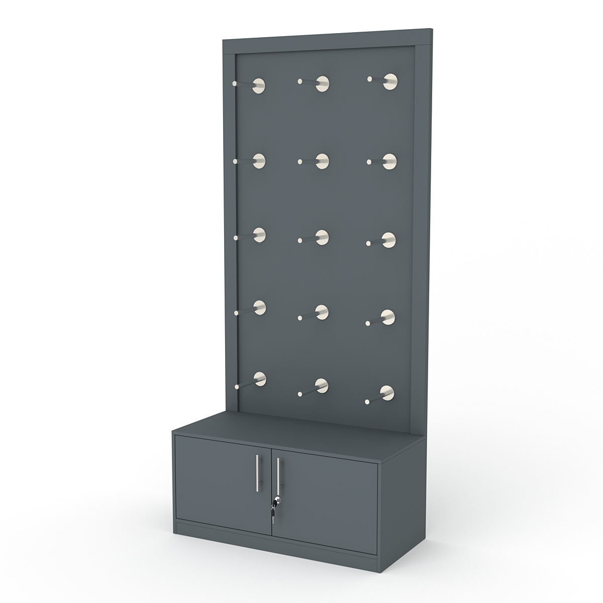 Конструкция выполнена из ДСП. Задняя стенка представляет собой экономпанель с кронштейнами. В основании находится прямоугольная тумба с дверцами. Дверцы закрываются на ключ.