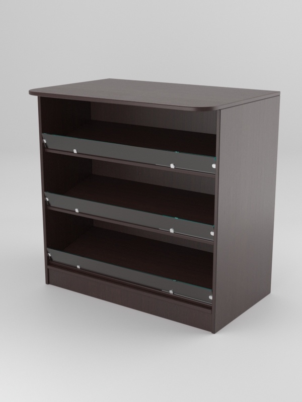 Каркас прилавка выполнен из ЛДСП, передние ограничители — стеклянные. Цвет прилавка можно выбрать в одном из семи вариантов.