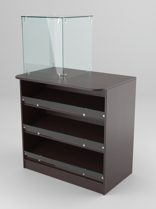 Прилавок для продажи табачных изделий. С лицевой стороны прилавка расположены три наклонные полки с передними ограничителями. С обратной стороны имеется четыре отделения для хранения товарных запасов. Конструкция дополнена прозрачной надставкой.