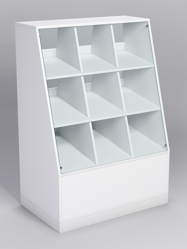 Прилавок имеет прочный каркас из ЛДСП. Конструкция прилавка включает витрину и накопитель. Витрина содержит три наклонные полки. Полки разграничены перегородками, в результате чего получается девять отделений. Передняя стенка витрины наклонная, выполнена из стекла. Задняя стенка отсутствует, делая возможным доступ к товару со стороны продавца. Под витриной располагается накопитель с одной полкой. Накопитель также открыт с внутренней стороны.