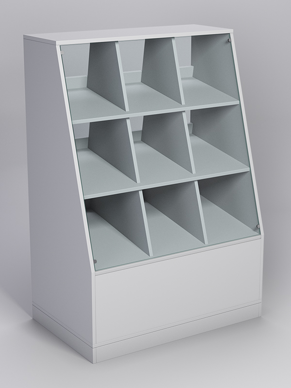 Прилавок имеет прочный каркас из ЛДСП. Конструкция прилавка включает витрину и накопитель. Витрина содержит три наклонные полки. Полки разграничены перегородками, в результате чего получается девять отделений. Передняя стенка витрины наклонная, выполнена из стекла. Задняя стенка отсутствует, делая возможным доступ к товару со стороны продавца. Под витриной располагается накопитель с одной полкой. Накопитель также открыт с внутренней стороны.