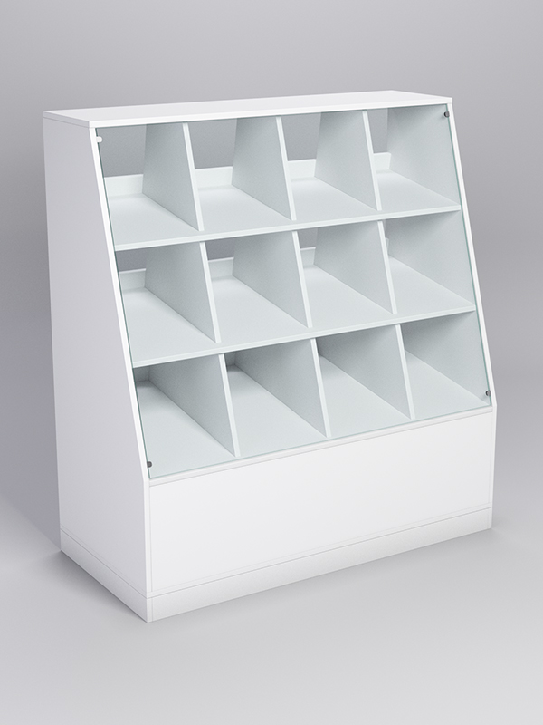 Каркас из ДСП. Полки наклонные, разделены перегородками на секции. Данная модель имеет 12 секций. Внизу прилавка, с внутренней стороны, есть отделение с полкой.