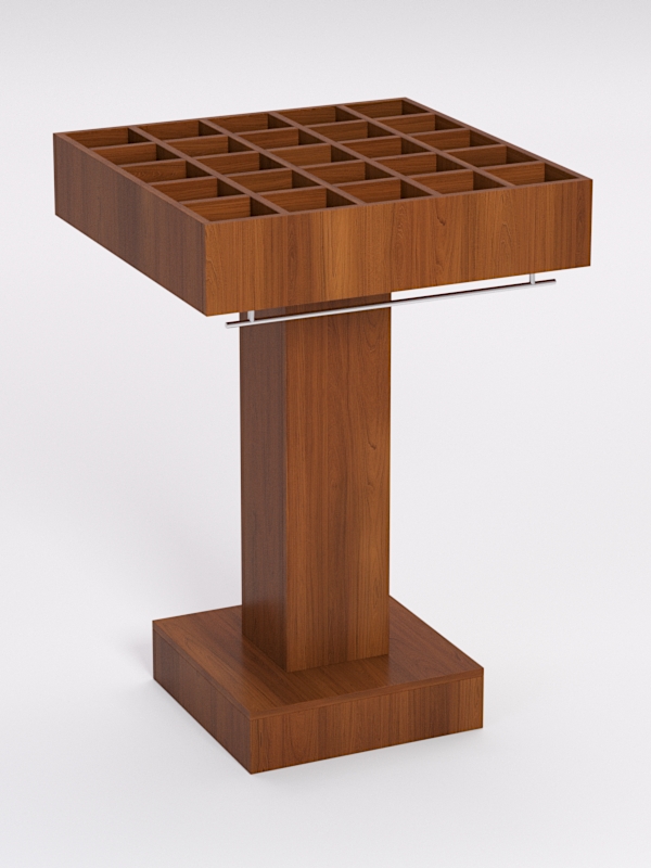 Стеллаж-стойка для демонстрации мужских эксклюзивных галстуков. Конструкция имеет небольшие размеры и 25 ячеек, позволяющие легко закрепить галстуки для наглядной презентации. Данный мебельный аксессуар очень удобен для размещения за кассовой зоной.