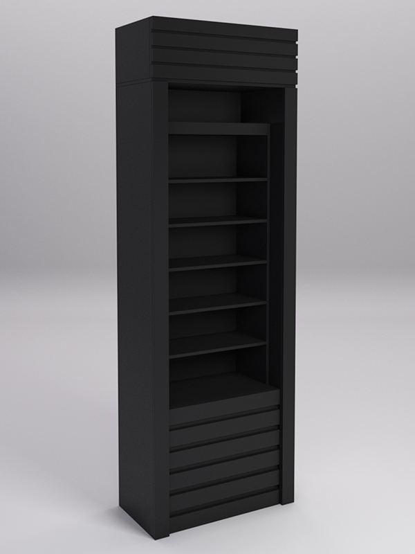 Данная модель представляет собой закрытый стеллаж с подиумом и шестью полками. В качестве седьмой полки используется крыша подиума.