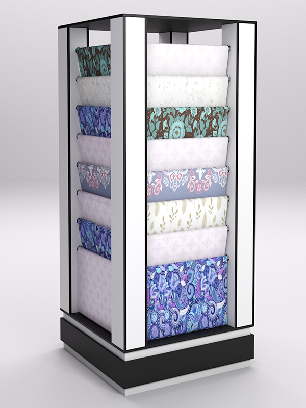Лучшее решение для продавца — использовать специальные стеллажи. Конструкция стеллажа позволяет расположить ткань в развешенном состоянии, избавляет ее от смятия, обеспечивает легкий доступ для тактильного контакта.