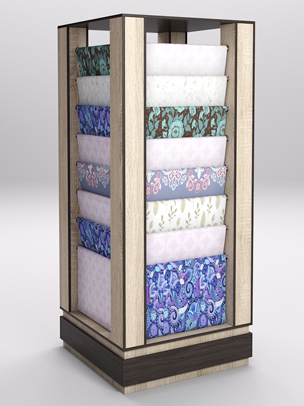 Лучшее решение для продавца — использовать специальные стеллажи. Конструкция стеллажа позволяет расположить ткань в развешенном состоянии, избавляет ее от смятия, обеспечивает легкий доступ для тактильного контакта.