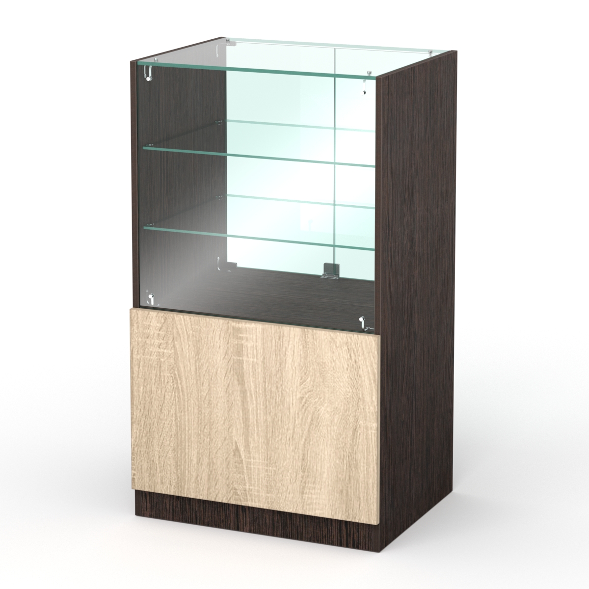 Прилавок подойдет для магазинов различного профиля. Предназначен для ведения расчетов, а также демонстрации товаров покупателю. Конструкция состоит из витрины и накопителя. Витрина содержит две полки, оборудована дверцами с замком. Накопитель открыт со стороны продавца. Внутри имеется полка. Каркас выполнен из ЛДСП и стекла. Цвет подбирается в вариантах стандарт и на заказ.