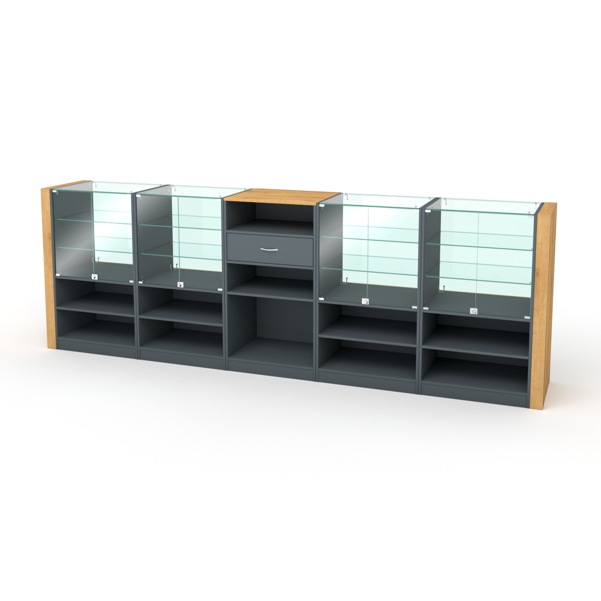 Данная модель состоит из 5-и частей: кассовая (центральная часть) и 4 боковые стеклянные части для выкладки мелкого товара и аксессуаров.