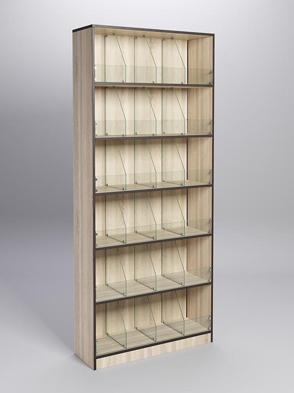 Стеллаж для конфет и орехов представляет из себя комбинацию Стеллажа «Эконом» №1 и вставок-конфетниц, которые являются отдельными элементами конструкции и ставятся на полки стеллажа. Ширина каждой застекленной ячейки — 205мм, высота каждой ячейки — 345мм. Общее кол-во ячеек в представленном стеллаже — 24 шт.