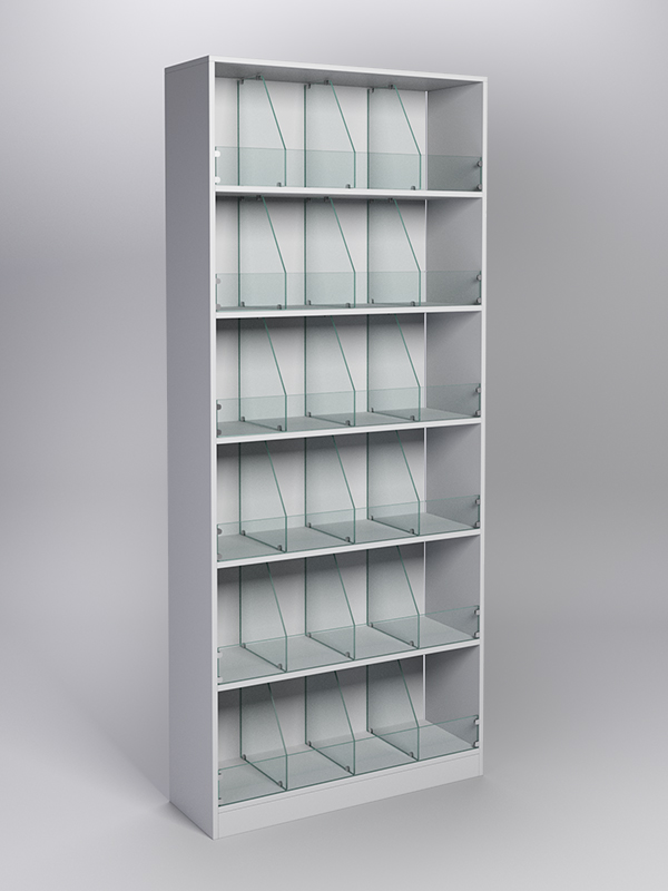 Стеллаж для конфет и орехов представляет из себя комбинацию Стеллажа «Эконом» №1 и вставок-конфетниц, которые являются отдельными элементами конструкции и ставятся на полки стеллажа. Ширина каждой застекленной ячейки — 205мм, высота каждой ячейки — 345мм. Общее кол-во ячеек в представленном стеллаже — 24 шт.