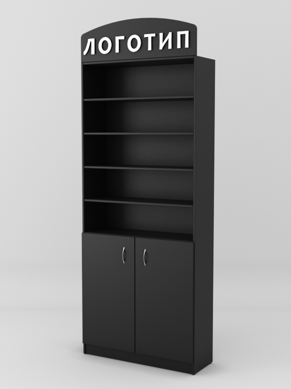 Накопитель оборудован распашными дверками. На крыше стеллажа имеется полукруглая панель для размещения логотипа.
