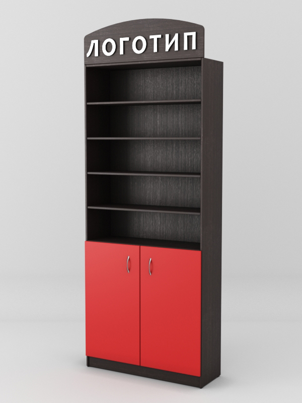 Накопитель оборудован распашными дверками. На крыше стеллажа имеется полукруглая панель для размещения логотипа.