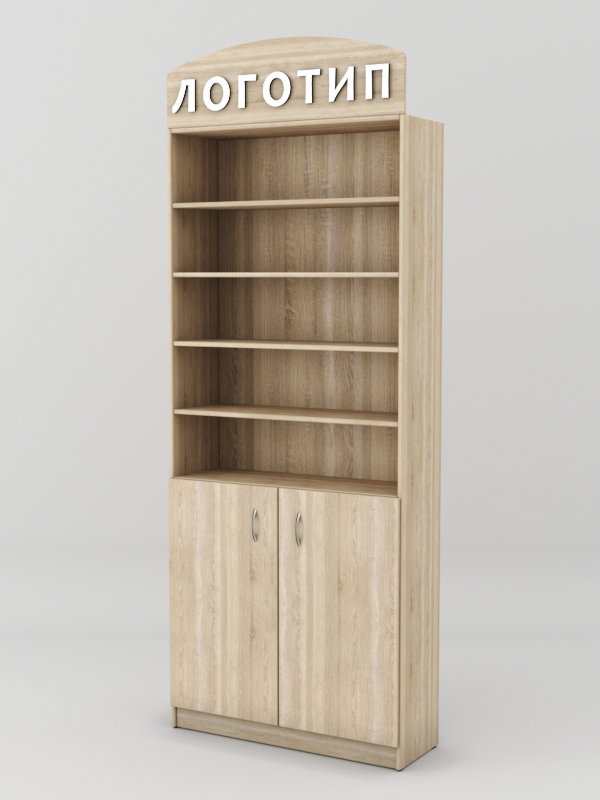 Накопитель оборудован распашными дверками. На крыше стеллажа имеется полукруглая панель для размещения логотипа.