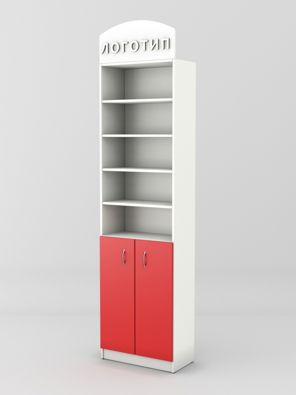 Накопитель оборудован распашными дверками. На крыше стеллажа имеется полукруглая панель для размещения логотипа.