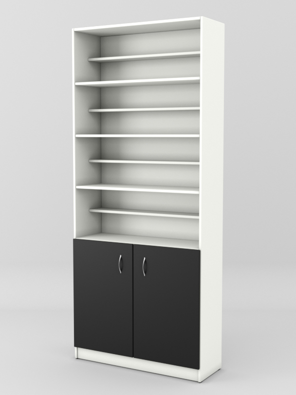 Конструкция состоит из семи полок и накопителя с распашными дверками.