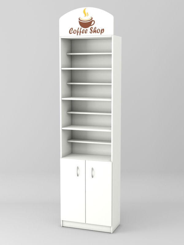 Конструкция состоит из четырех полок и накопителя с распашными дверками. На крыше стеллажа имеется полукруглая панель для размещения логотипа.