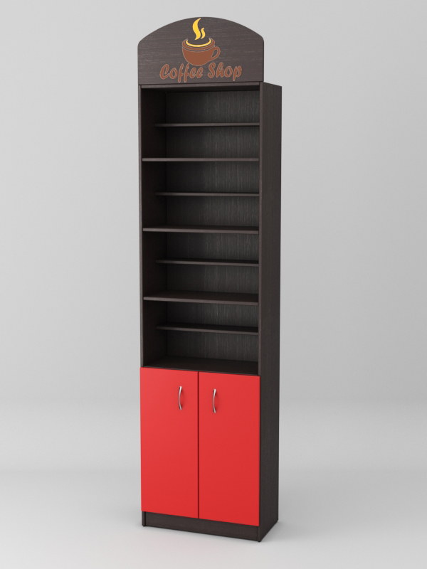 Конструкция состоит из четырех полок и накопителя с распашными дверками. На крыше стеллажа имеется полукруглая панель для размещения логотипа.