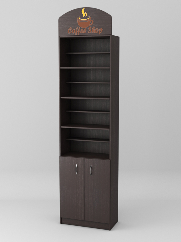 Конструкция состоит из четырех полок и накопителя с распашными дверками. На крыше стеллажа имеется полукруглая панель для размещения логотипа.