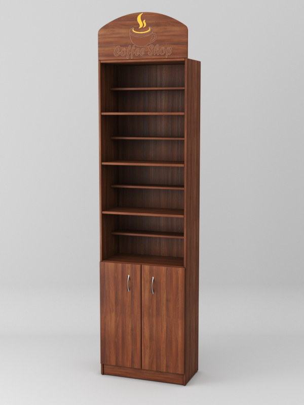 Конструкция состоит из четырех полок и накопителя с распашными дверками. На крыше стеллажа имеется полукруглая панель для размещения логотипа.