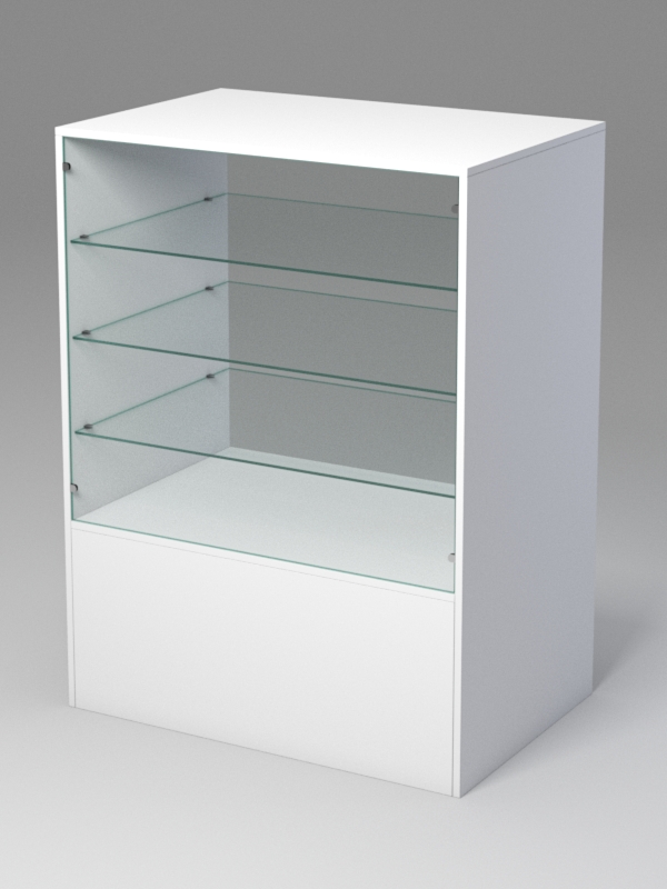 Прилавок предназначен для демонстрации обеденной и декоративной посуды. Конструкция выполнена в виде стеллажа с открытой задней стенкой. Внутри находятся три стеклянные полки. При равномерном распределении посуды нагрузка на стекло составляет 5-7кг.
