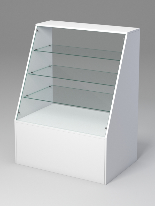 Прилавок предназначен для демонстрации обеденной и декоративной посуды. Конструкция выполнена в виде стеллажа с открытой задней стенкой. Боковые стенки имеют трапецевидную форму. Внутри находятся три стеклянные полки. При равномерном распределении посуды нагрузка на стекло составляет 5-7кг.