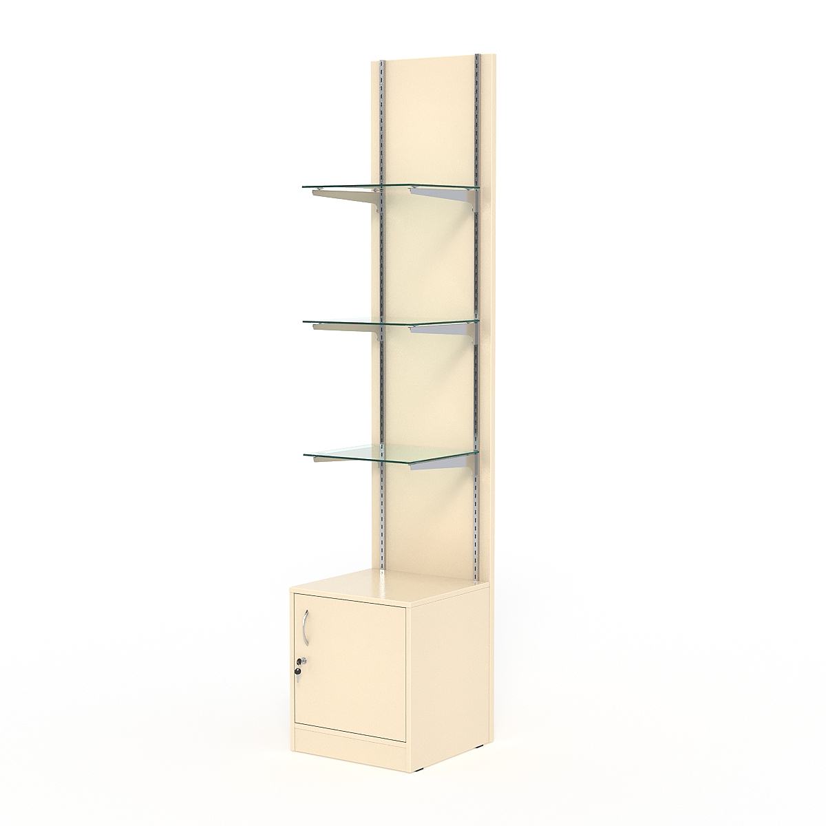 Стеллаж представляет собой открытую конструкцию с задней стенкой и накопителем из ДСП. На стенке располагаются три стеклянные полки. Дополнительную прочность каркасу придают металлические вставки и держатели полок. Накопитель оборудован распашной дверью с замком. Нагрузка на полки при равномерном распределении предметов — 5-7кг.