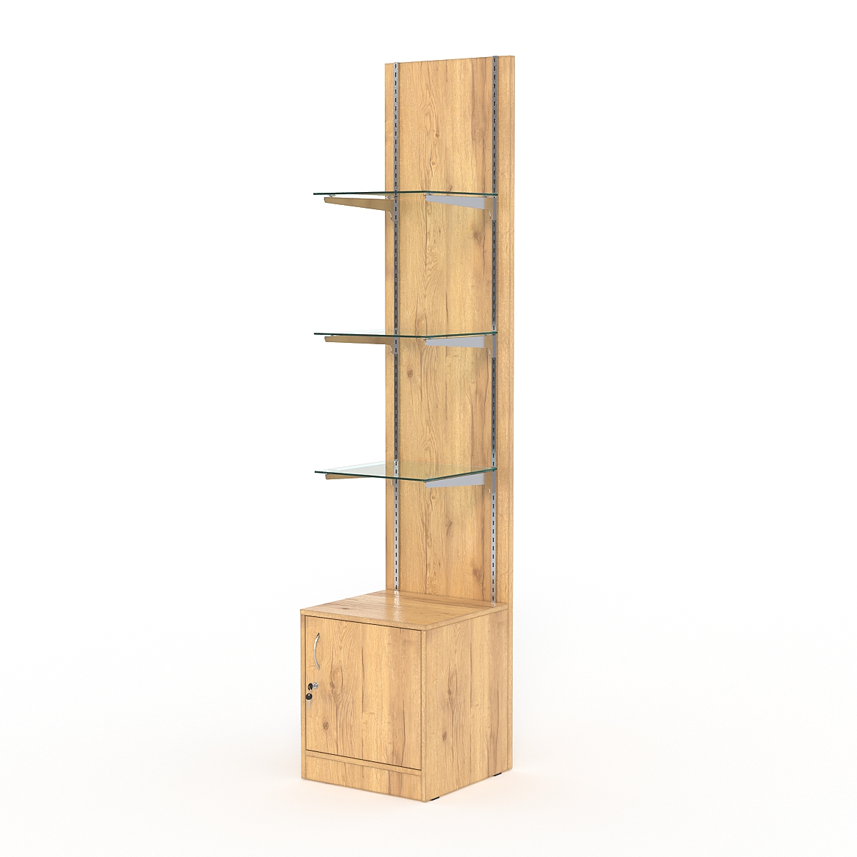 Стеллаж представляет собой открытую конструкцию с задней стенкой и накопителем из ДСП. На стенке располагаются три стеклянные полки. Дополнительную прочность каркасу придают металлические вставки и держатели полок. Накопитель оборудован распашной дверью с замком. Нагрузка на полки при равномерном распределении предметов — 5-7кг.
