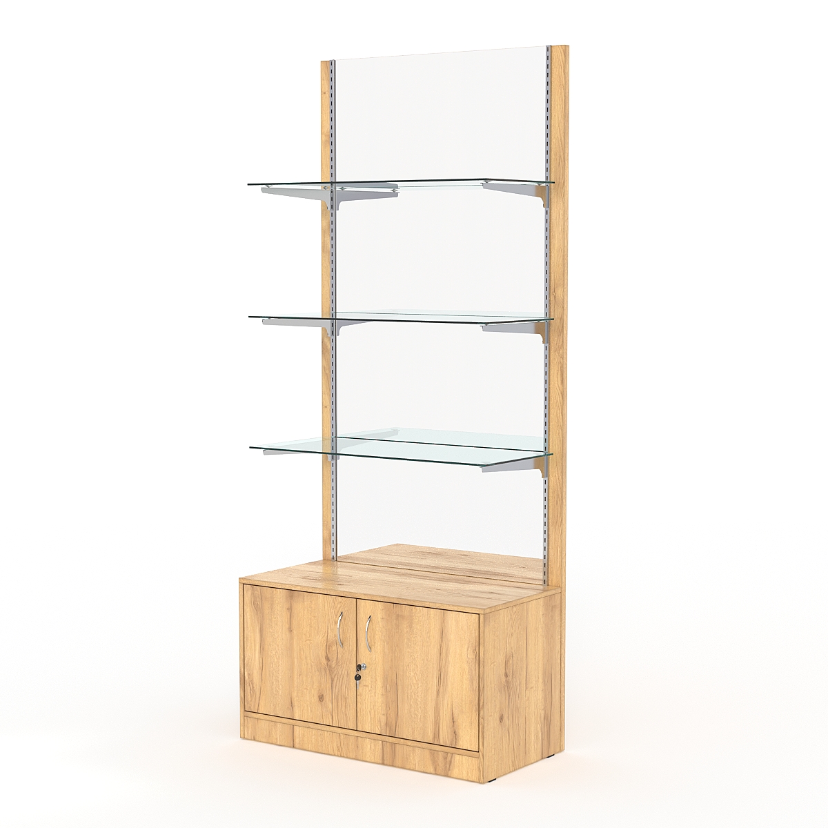 Стеллажи серии Астерия предназначены для размещения непродовольственной категории товаров, таких как парфюмерия, одежда, обувь. Деревянные панели в сочетании со стеклянными полками производят впечатление солидности и основательности, вызывая у покупателя невольное уважение к продаваемому товару.