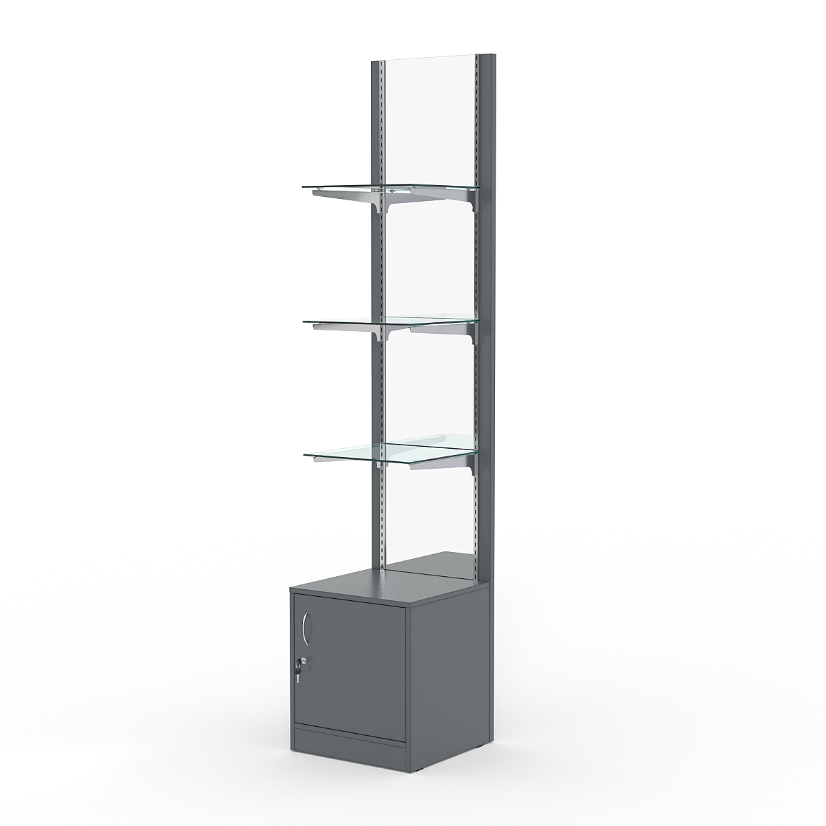 Стеллаж представляет собой открытую конструкцию с зеркальной задней панелью и накопителем из ДСП. На панели располагаются три стеклянные полки. Дополнительную прочность каркасу придают металлические вставки и держатели полок. Накопитель оборудован распашной дверью с замком. Нагрузка на полки при равномерном распределении предметов — 5-7кг.
