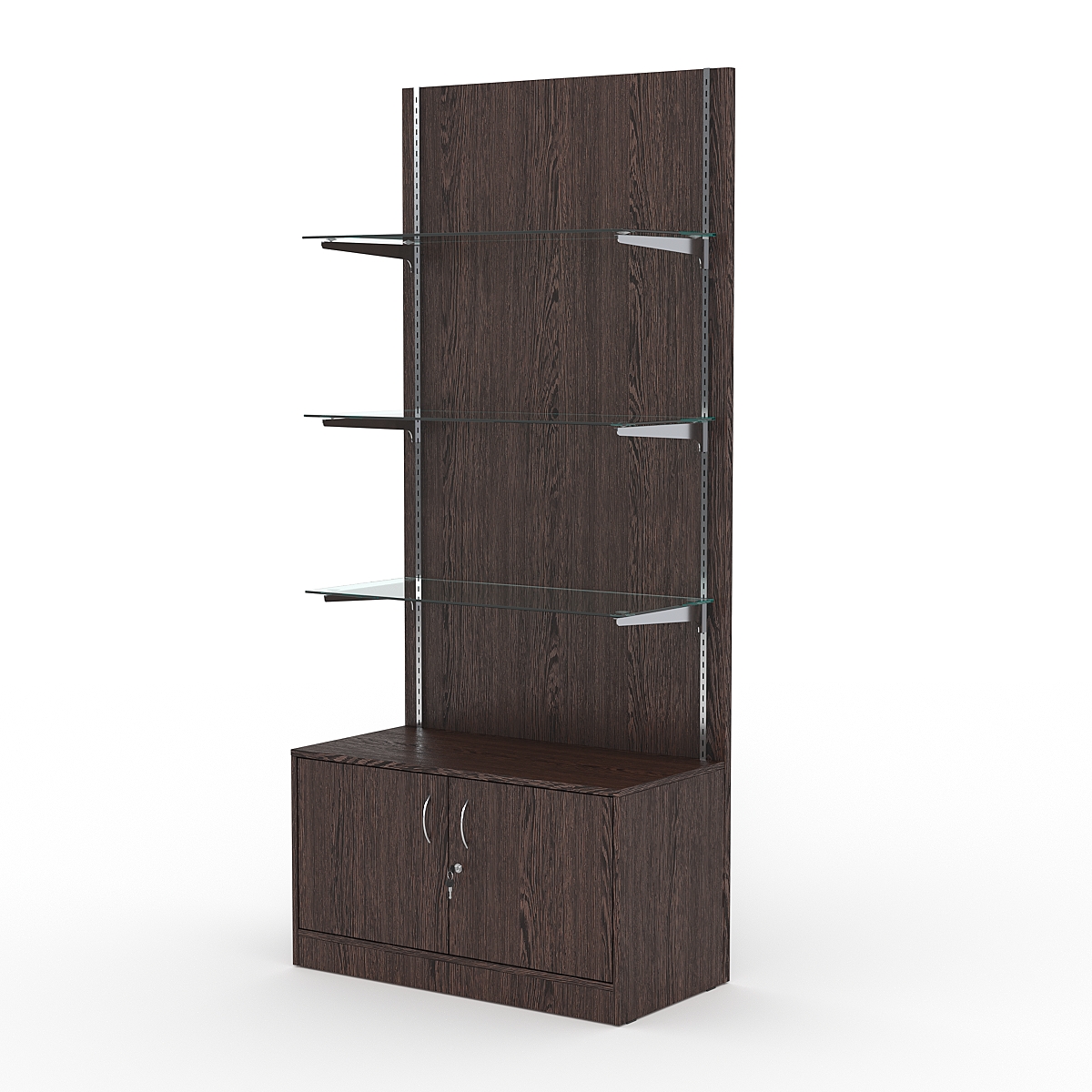 Каркас из ДСП. Три стеклянные полки. Нагрузка на полки — 5-7кг при равномерном размещении продукции. В основании — тумба с дверями, закрывающимися на ключ.