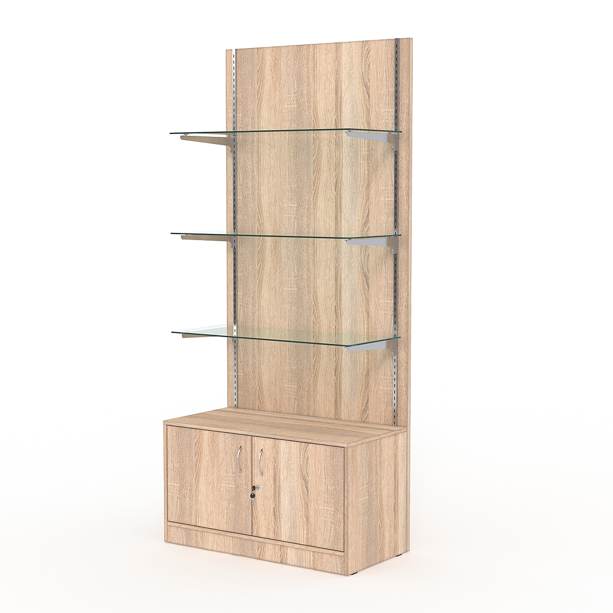 Стеллажи серии Астерия предназначены для размещения непродовольственной категории товаров, таких как парфюмерия, одежда, обувь. Деревянные панели в сочетании со стеклянными полками производят впечатление солидности и основательности, вызывая у покупателя невольное уважение к продаваемому товару.