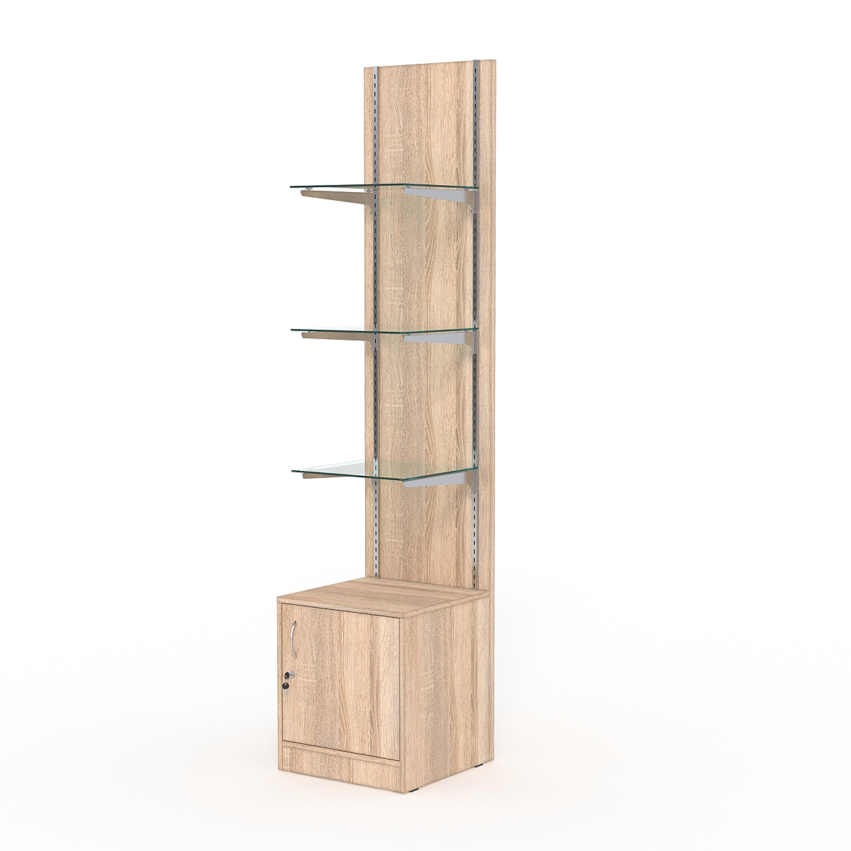 Стеллаж представляет собой открытую конструкцию с задней стенкой и накопителем из ДСП. На стенке располагаются три стеклянные полки. Дополнительную прочность каркасу придают металлические вставки и держатели полок. Накопитель оборудован распашной дверью с замком. Нагрузка на полки при равномерном распределении предметов — 5-7кг.
