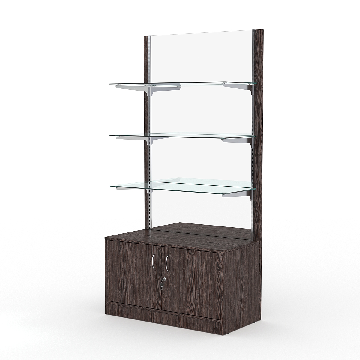 Стеллажи серии Астерия предназначены для размещения непродовольственной категории товаров, таких как парфюмерия, одежда, обувь. Деревянные панели в сочетании со стеклянными полками производят впечатление солидности и основательности, вызывая у покупателя невольное уважение к продаваемому товару.