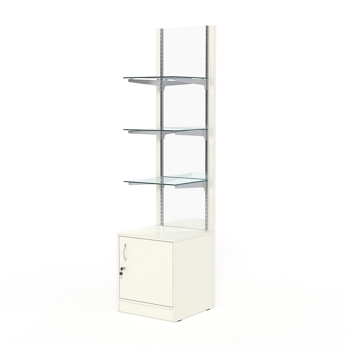 Стеллаж представляет собой открытую конструкцию с зеркальной задней панелью и накопителем из ДСП. На стенке располагаются три стеклянные полки. Дополнительную прочность каркасу придают металлические вставки и держатели полок. Накопитель оборудован распашной дверью с замком. Нагрузка на полки при равномерном распределении предметов — 5-7кг.